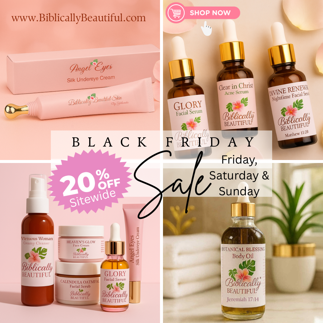 We believe skincare should be as pure as your faith. Blending the purity of Scripture with the luxury of clean, high-performance skincare. That’s why every product is formulated with ingredients you can trust — free from toxins, fillers, and compromise. Rooted in biblical principles, and backed by integrity. Because what touches your skin matters to God, so it matters to us.